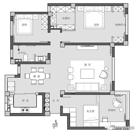 ▲設計改造: *入戶結合過道新建墻體設計一組玄關柜; *拆除廚房和餐廳的墻體,將廚房儲物間納入餐廳,引進自然光線,擴大了餐廳面積同時規劃出一個利用率更高的大廚房; *次衛改成干濕分離,打散狹長的過道同時讓生活更加便捷; *主衛改成衣帽間,儲物功能更強大,視覺空間更開闊,實用性更強。
