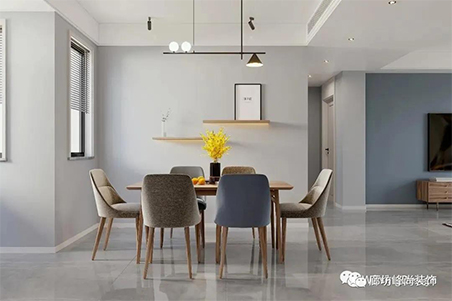 在餐廳的區域設計比較簡單,深色木質餐桌 大方實用。置物層板與低飽和色彩形成一種強烈的空間感,適度的留白手法將視野拓寬,無限延展空間。 餐廳背后的推拉門進去便是廚房,備餐到用餐,合理的家居動線設計,讓生活變得更加輕松。