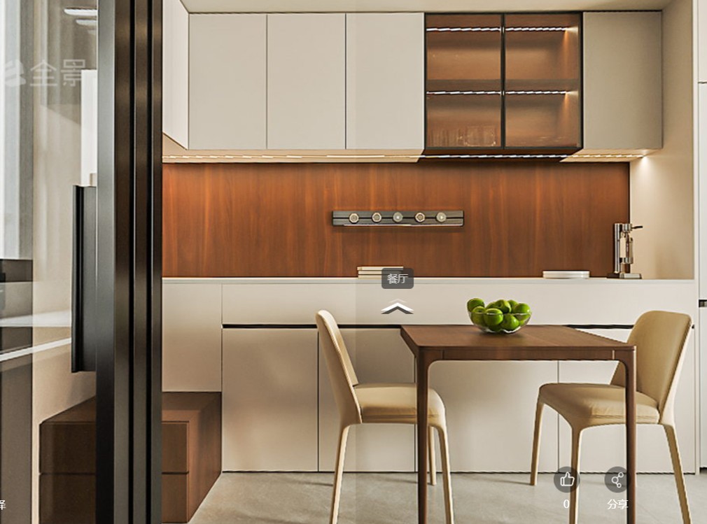 以木色背景墻 呼應廚房深棕櫥柜,白色啞光柜體穿插其中,玻璃柜門露出精致餐具,營造「溫潤秩序感」